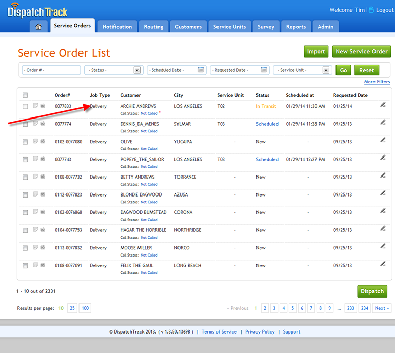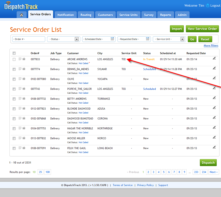 7. The Service Unit column contains the Service Unit name assigned to that Order.