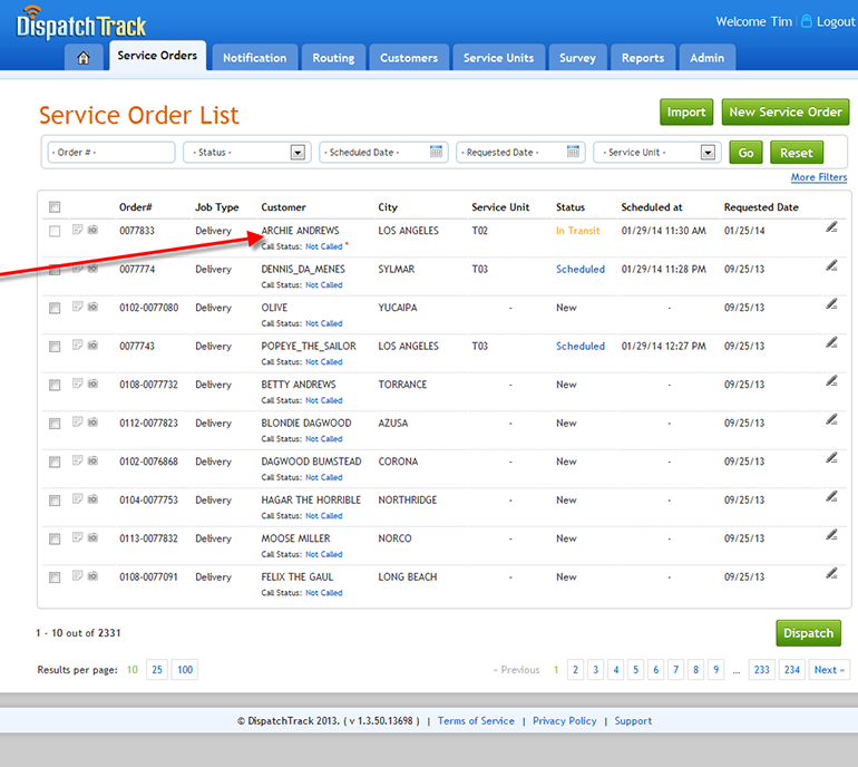 5. The Customer column contains the customer’s name and just below the name, the Call Status