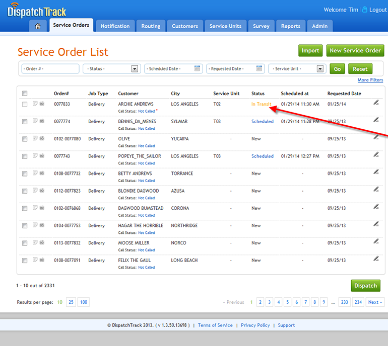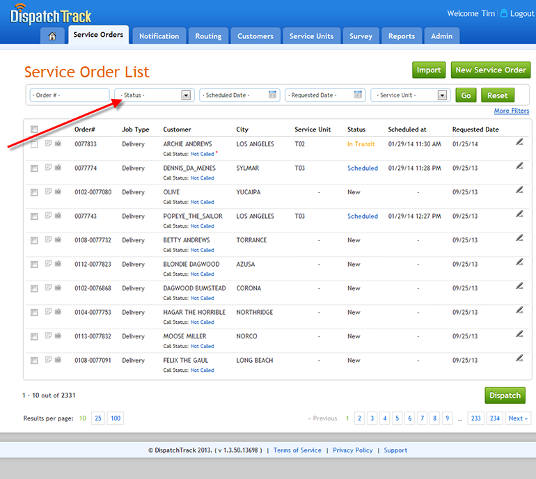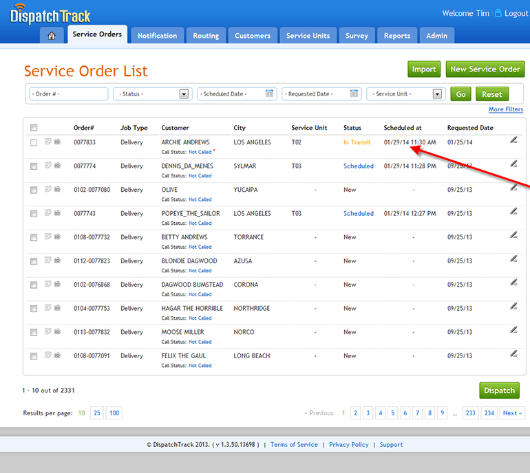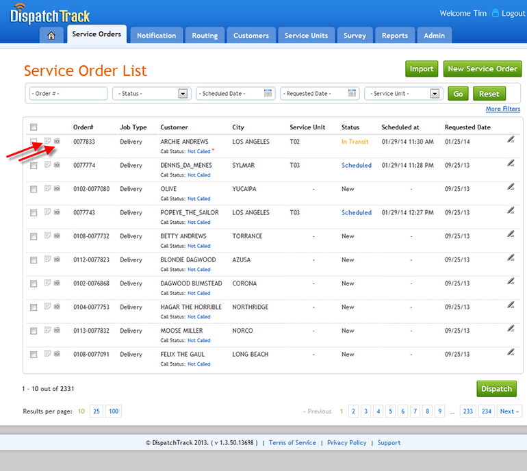 1. Notice that each line in the Service Order screen corresponds to one Service Order. There is a checkbox next to each Order. Multiple checkboxes may be selected and the Dispatch button at the bottom clicked to dispatch these Orders at one shot. (The Dispatch button takes you to the Assign popup from which a Service Unit and a date for service may be assigned).